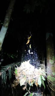 After dinner the other person on the trip, Lancelot showed Jose our guide the tarantula under our tent platform. Who was not impressed saying that was just a small male. He proceeded to then search for a larger one. Within a few minutes he found a large female on a thatched roof of one of the empty tents. The most impressive and scary thing about this was how easy it hid from us. Within a matter of seconds it was able to tuck itself into the leaves of the thatched roof and completely hidden! (Tiffany was in the safety of the tent with a book).